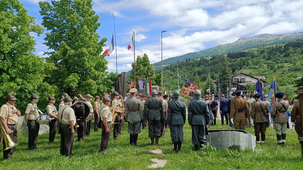 Sfilata dal Comune sino al Monumento ai Caduti dell Chaberton per le alzabandiera, francese e italiana, deposizione corona, discorsi e poi altri Oniri ai Caduti nel cimitero militare.